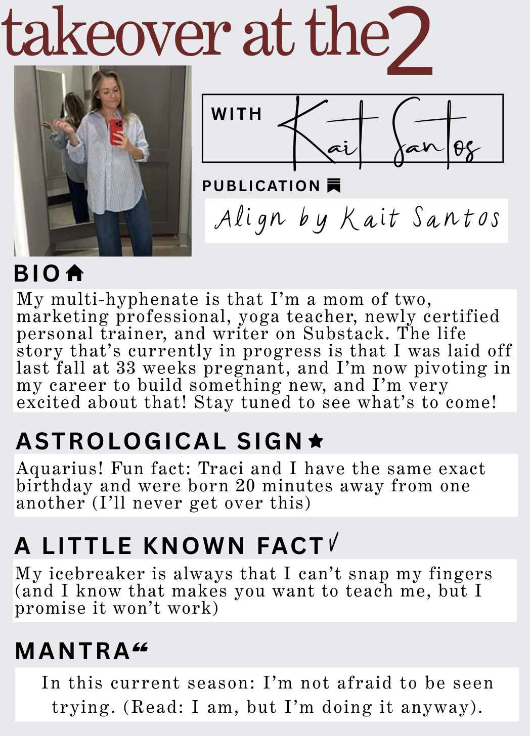 I am beyond excited to feature Kait Santos from Align with Kait Santos! Her work centers on weekly newsletters and classes focused on finding alignment through movement and breathwork. She’s currently on a brief maternity leave but will be back soon!