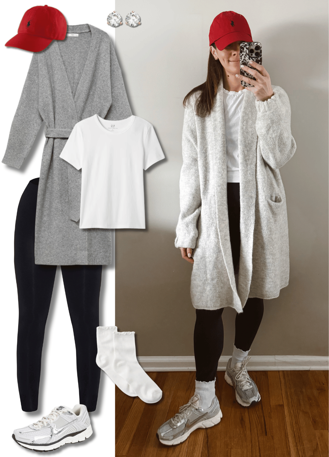 Leggings were clearly the theme of the week. I paired them with a basic white tee, an oversized sweater, a red hat, and comfy sneakers.