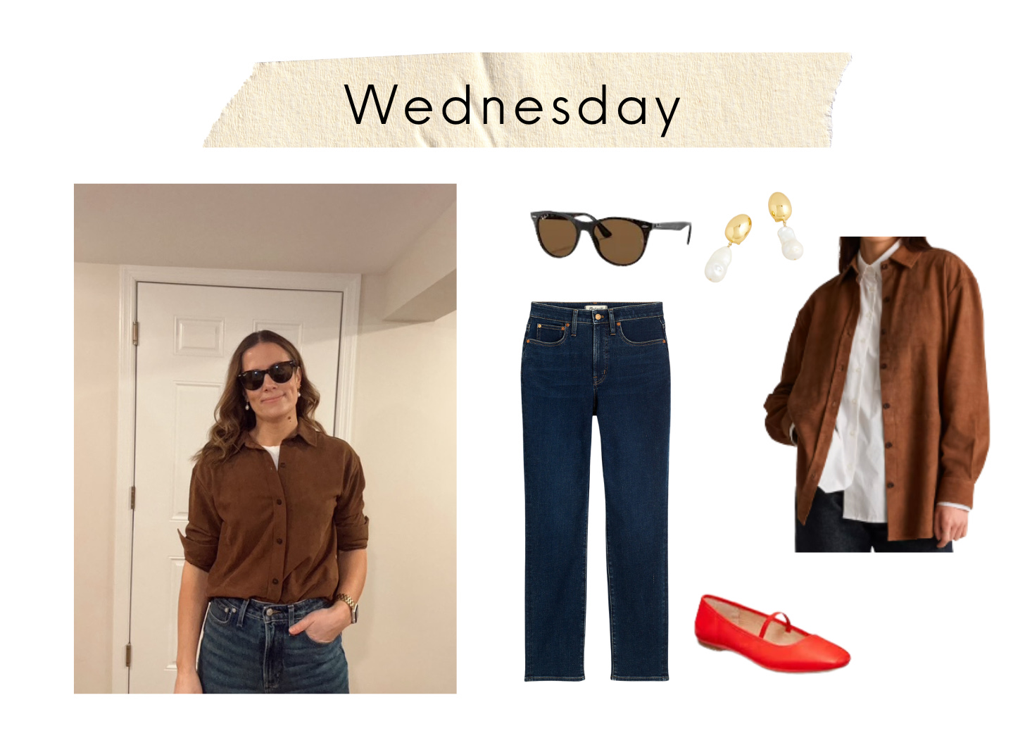 Links: Suede shirt jacket // Denim // Red flats // Sunglasses // Pearl earrings