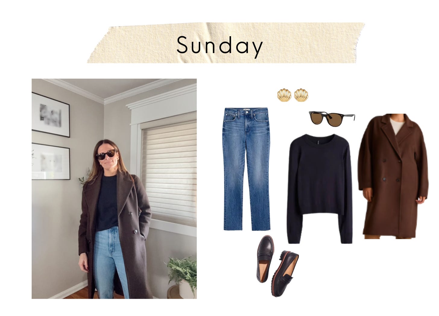 Links: Brown coat // Jeans // Black loafers // Navy sweater // Sunglasses