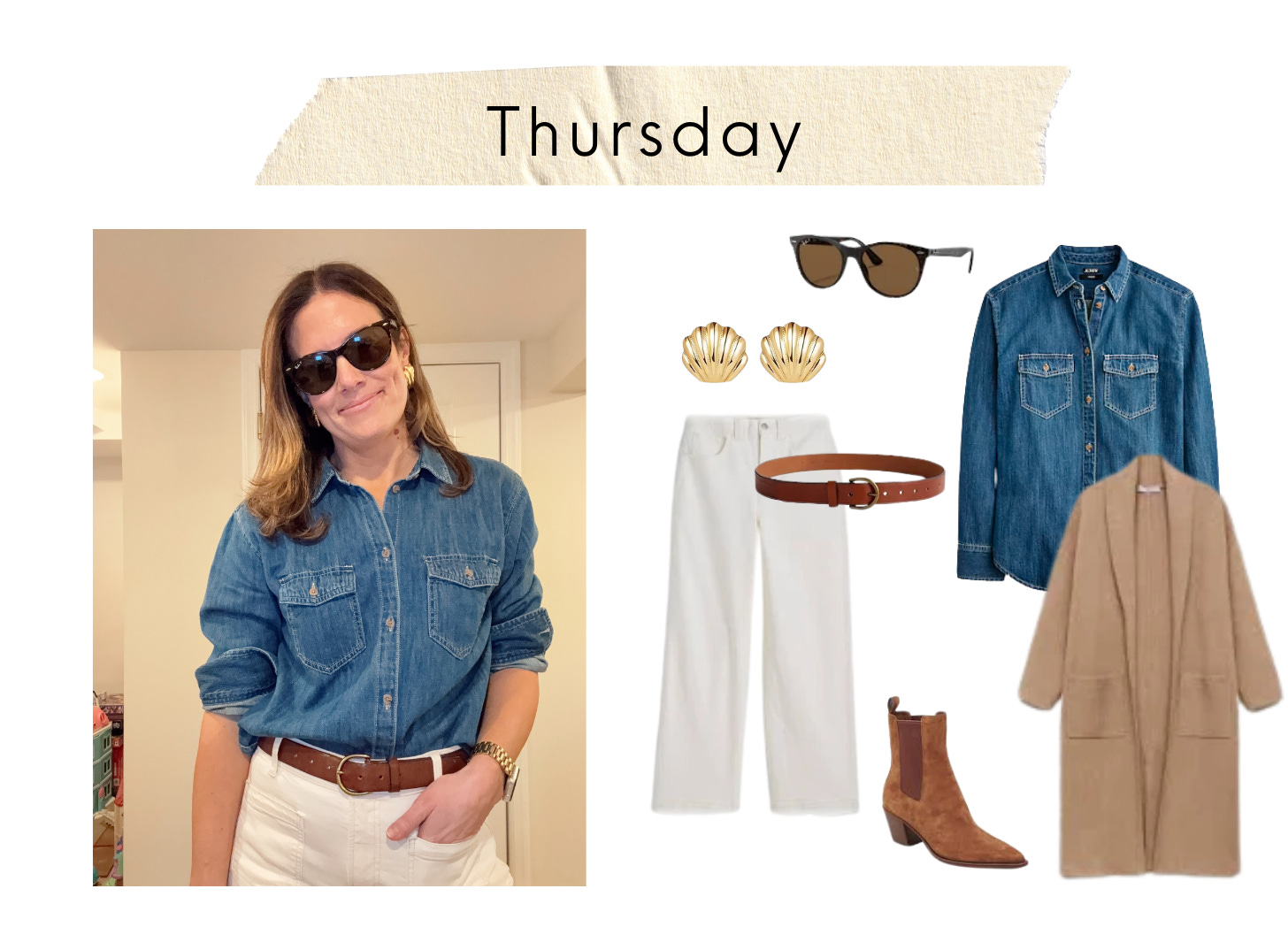 Links: Denim shirt // White denim // Suede boots // Sweater coat // Brown belt // Sunglasses // Gold earrings (Shell) // Gold earrings (Magical light ones)