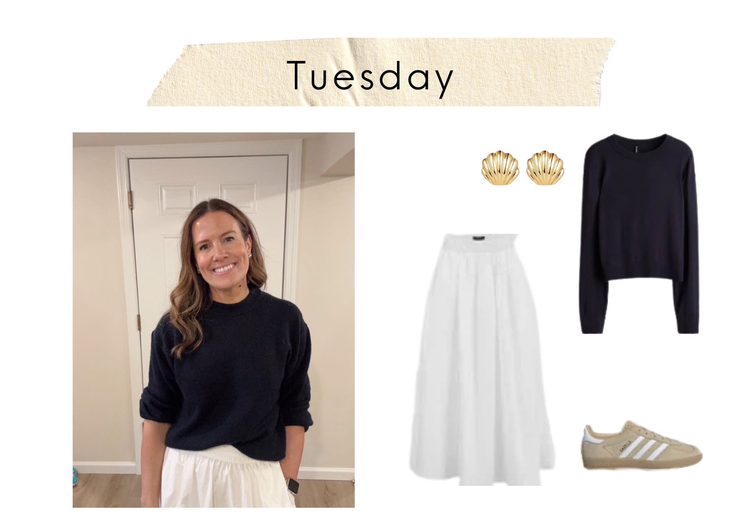 Links: Navy sweater // White skirt // Amazon White Skirt // Adidas sneakers // Shell earrings