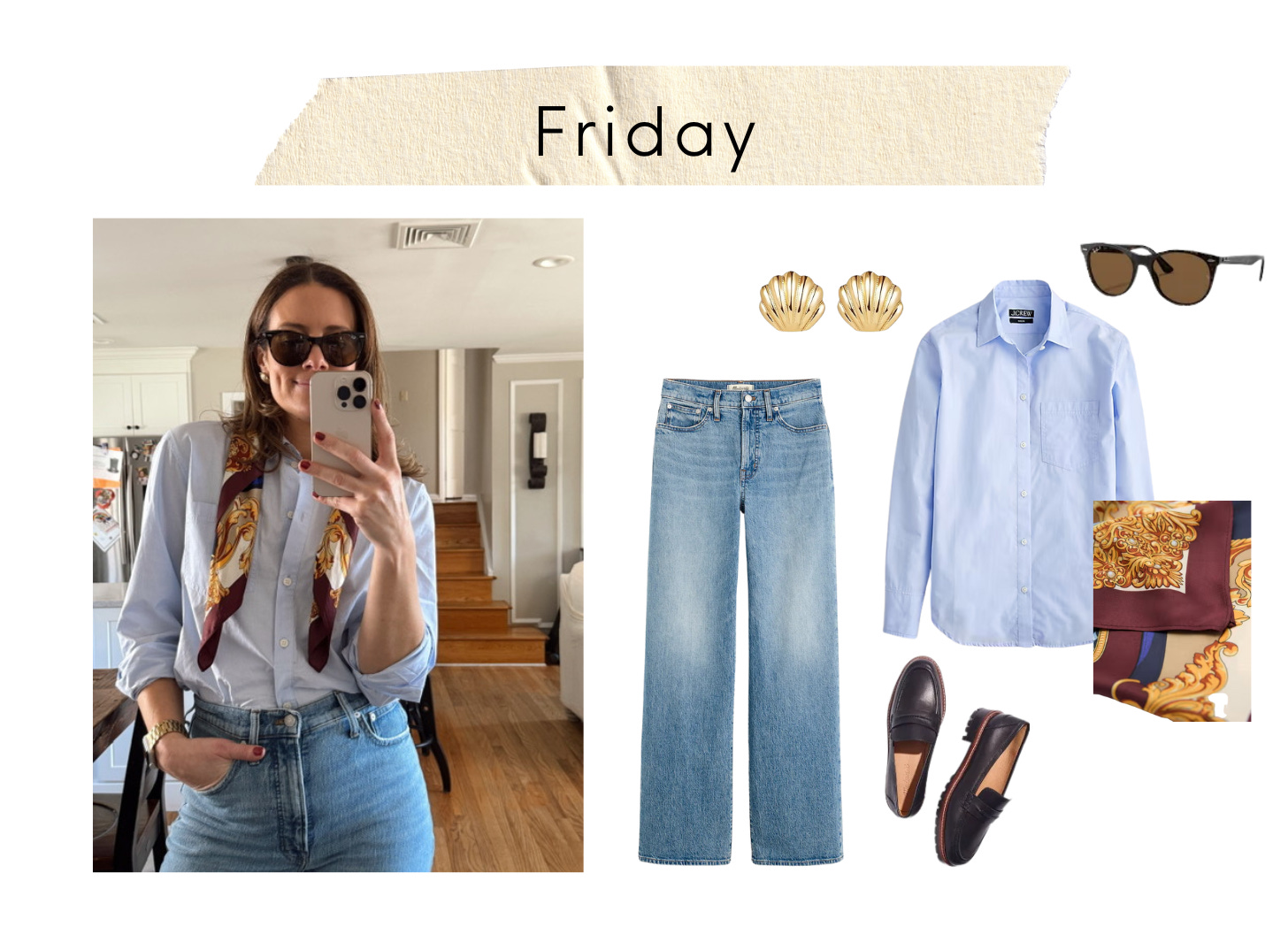 Links: Blue oxford // Jeans // Shell earrings // Scarf // Amazon Scarf (Just got this!) // Sunglasses // Black loafers