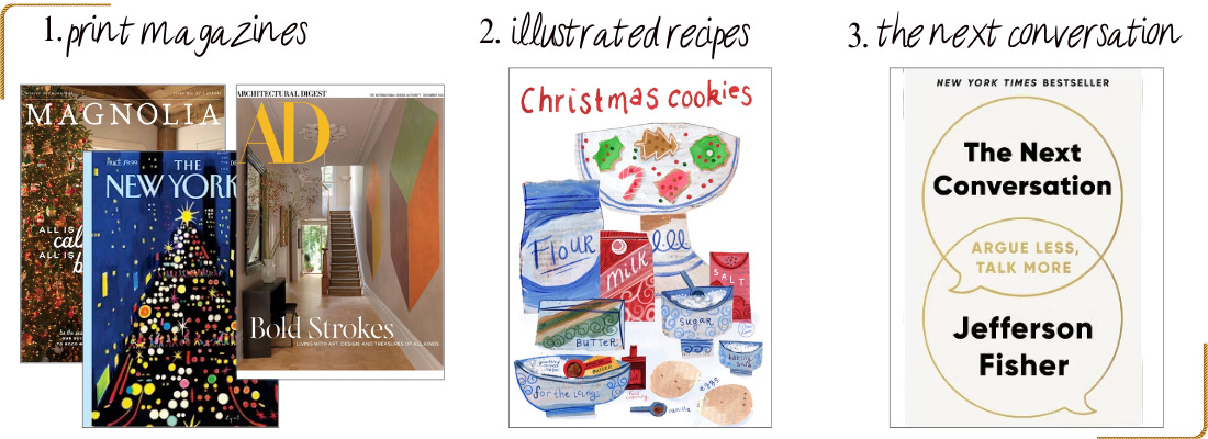 PRINT MAGAZINES - The Four-Shirted-Husband™ and I recently secured babysitters for date night. He asked what I wanted to do for date night… the world was our oyster! I chose Panera in sweats and a leisurely walk around Barnes & Noble. I got lost in the magazine aisle and scooped up some of my favorites. There’s something so special about browsing a physical magazine!5 Plus, I snagged some magazines for my kids’ stocking stuffers.