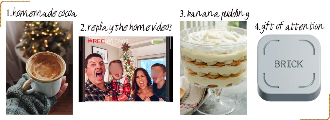 GIFT OF UNDIVIDED ATTENTION - We did it—we got a Brick (purchased with my own $). It’s a tiny square block that blocks distracting phone apps so you can actually focus on life. Is it pathetic that I need this tiny block to finally put my phone down? Yes. Am I loving the way it’s forcing me to reallocate my time? 100%. As of today my screentime is down 67%3. That’s pretty wild.4