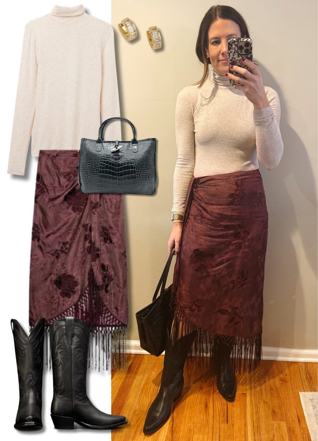 Wore this look to work on Monday: a fringe wrap skirt, turtleneck & some cowgirl boots- complete 100/10.